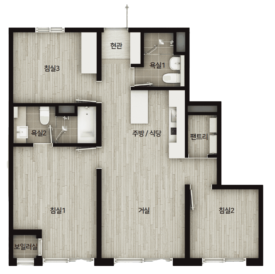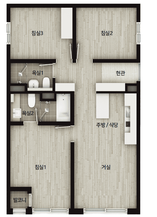 3 Room, 2 Bath, 3 Bay 평면과 풀옵션 마감재 미공군 맞춤형 공간설계!